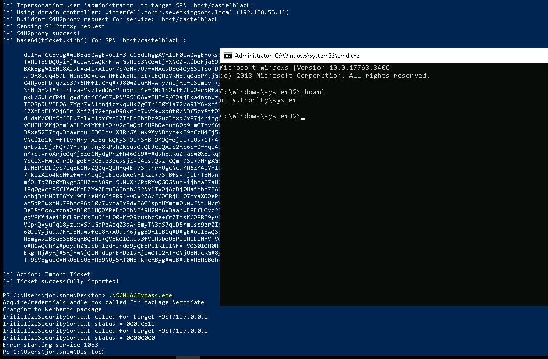 And just like the writeup made by @an0n_r0 we launch SCMUACBypass.exe by Tyranid and get a system shell