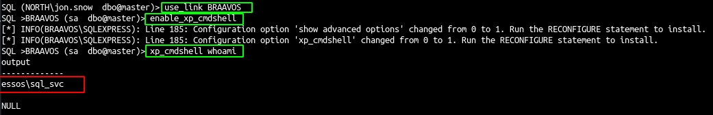 Because the link use sa as remote login on braavos we can enable cmd and launch command.